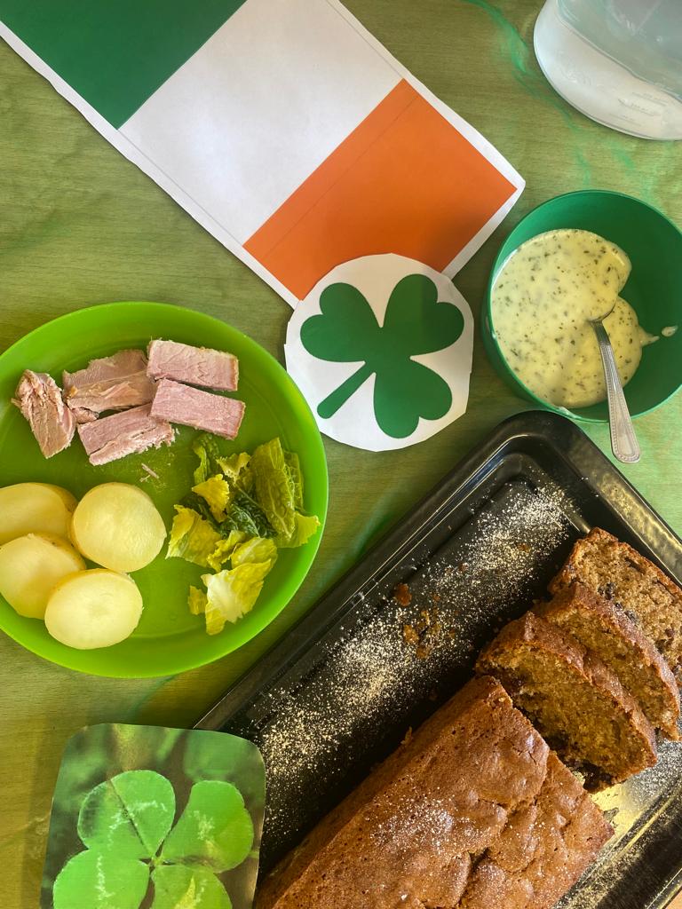 For lunch we had a traditional Irish dinner suggested by one of our Irish parents. The children enjoyed gammon, potatoes & cabbage with parsley sauce followed by Porridge Cake that the Inventors made the day before. Yum! During lunch, we spoke about our favourite foods from around the world. “Pasta!” from Italy was a popular choice!